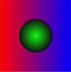 Der Farbverlauf rot zu blau wird mit Hilfe von Linien der Dicke 2 Pixel gezeichnet. Die erste Linie ist rot, nach jeder gezeichneten Linie wird die rote Fabkomponente verkleinert und die blaue vergrössert. Mit der zweiten for-Schleife werden immer kleinere gefüllte Kreise gezeichnet, wobei nach jedem gezeichneten Kreis der grüne Farbanteil vergrössert wird.