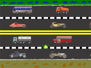 Ein Frosch soll die beiden Strassen überqueren, ohne überfahren zu werden. In unserer Implementierung wird der Frosch bei Kollision mit einem Auto nicht "richtig" überfahren, sondern jeweils an die Startposition am unteren Rand des Fensters zurückversetzt, wo er einen neuen Versuch starten kann. Wenn er den grünen Streifen am oberen Rand des Fensters erreicht hat, hat er das Ziel erreicht.