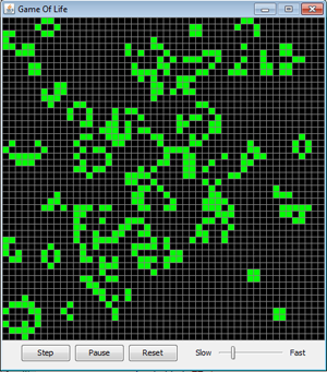 # Game of Life from gamegrid import * class Game(GameGrid): def __init__(self): GameGrid.__init__(self, s, s, 800 // s, Color.gray) self.setTitle("Game Of Life") self.reset() self.show() def reset(self): # Called when the reset button is clicked for x in range(s): for y in range(s): a[x][y] = 0 # All cells dead for n in range(z): loc = self.getRandomEmptyLocation() a[loc.x][loc.y] = 1 self.showPopulation() def showPopulation(self): for x in range(s): for y in range(s): loc = Location(x, y) if a[x][y] == 1: self.getBg().fillCell(loc, Color.green, False) else: self.getBg().fillCell(loc, Color.black, False) def getNumberOfNeighbours(self, x, y): nb = 0 for i in range(max(0, x - 1), min(s - 1, x + 2)): for k in range(max(0, y - 1), min(s - 1, y + 2)): if not (i == x and k == y): if a[i][k] == 1: nb = nb + 1 return nb # Automatically called at the end of each simulation cycle def act(self): global a b = [[0 for x in range(s)] for y in range(s)] for x in range(s): for y in range(s): nb = self.getNumberOfNeighbours(x, y) if a[x][y] == 1: # live cell if nb < 2: b[x][y] = 0 elif nb > 3: b[x][y] = 0 else: b[x][y] = 1 else: # dead cell if nb == 3: b[x][y] = 1 else: b[x][y] = 0 a = b self.showPopulation() s = 50 # Number of cells in each direction z = 1000 # Size of population at start a = [[0 for x in range(s)] for y in range(s)] Game() |