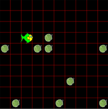 Du sollst den Roboter jetzt mit Pollen steuern, so wie im Beispiel 2. Die Steurung wird in der Methode act() definiert. Dabei bewegt sich der Roboter mit move() von Zelle zur Zelle und drücken der Cursorasten bewirkt die Richtungsänderung. Damit der Roboter an der richtigen Position und in der richtgen Richtung startet, gibst du im Hauptprogramm: |